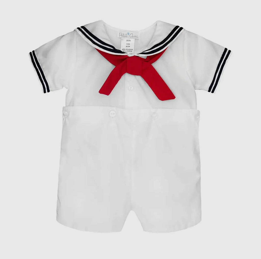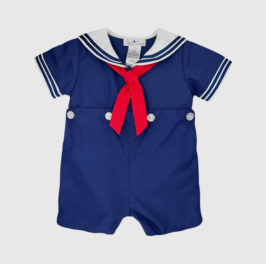 Our classic and traditional sailor style nautical bobby suit romper for baby boys makes a beautiful outfit for family photos and special occasions.